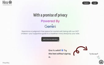 Hiro เป็นส่วนขยายของ Chrome ที่พัฒนาโดย rohkumar0126 ที่ออกแบบมาเพื่อเป็นเพื่อนคู่ความสุขทางจิตใจของคุณ ด้วยการใช้พลังงานจาก Gemini Hiro มอบการสนับสนุนและคำแนะนำที่ปรับให้เหมาะกับคุณเพื่อช่วยให้คุณมีจิตใจที่แข็งแรงขึ้น ด้วยส่วนขยายนี้คุณสามารถเผชิญกับความท้าทายในพื้นที่ที่ไม่มีการตัดสินใจ รู้สึกว่า Hiro จะอยู่เคียงข้างคุณเสมอ